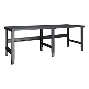 Workbench, 96W x 36D x 29-3/8to36-7/8In H?Industrial Workbenches and AccessoriesExtra heavy-duty steel construction. All benches have legs with front and rear knockouts for 2" electrical boxes. Adjustable legs have 1-1/2" increment adjustments. Feature 14-ga. steel stringers with a deep profile. Medium-gray powder-coated finish. Workbenches are available in 4 different work surfaces. Steel tops have 4-channel reinforcement. All accessories include installation hardware.Workbench, Leg Type Adjustable Height Straight, Workbench Assembly Unassembled, Material Steel, Work Surface Material Steel, Width 96 In., Depth 36 In., Height 29-3/8 to 36-7/8 In., Edge Type 1/2 In. Radius, Top Thickness 1-1/2 In., Gray, Finish Powder Coated, Load Rating 4000 lb., Includes Legs, Top, Stringer, (4) Knockouts