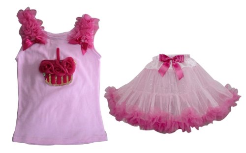 Beautiful pink tank top with ruffles sleeves hotpink cake on the middle and flying on either side of the shoulder. The set of 2 includes a sparkly pink tutu petti with hotpink ruffles on the bottom.